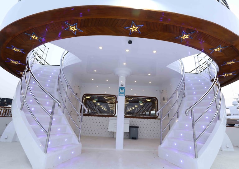 Third / Top Deck – A wide-open space with a 365° panoramic view, perfect for sunset cruises, live entertainment, and starlit dinners.